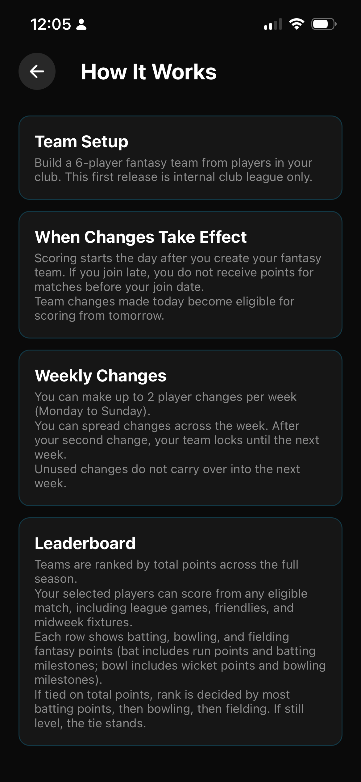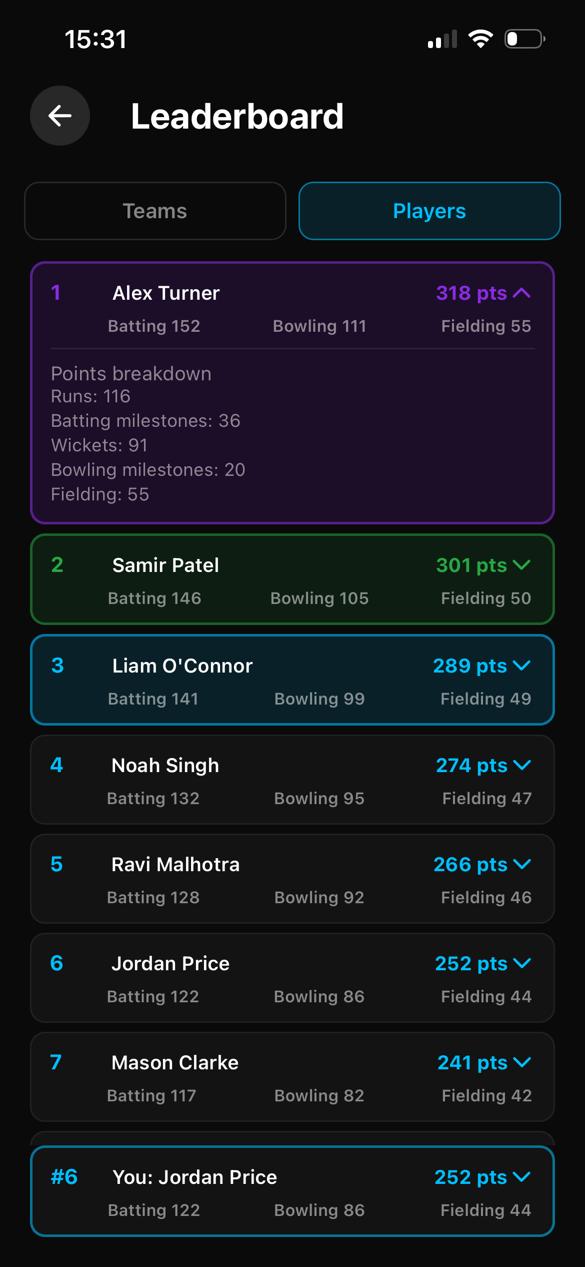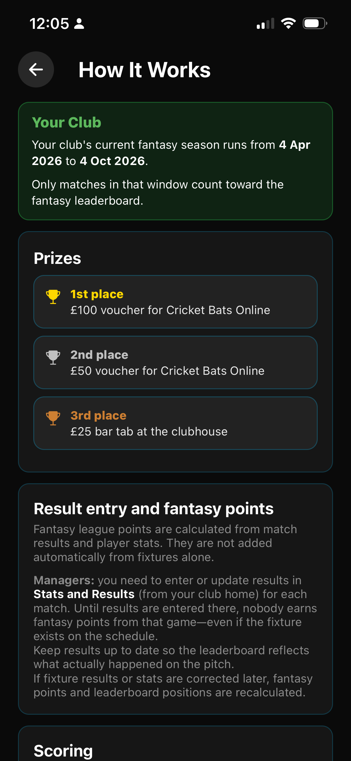 Points are not awarded just because a fixture exists on the schedule. They are calculated from batting, bowling and fielding stats entered under Stats and Results (club home → cricket stats flow). Until those results exist for a match, nobody gets fantasy points from that game.