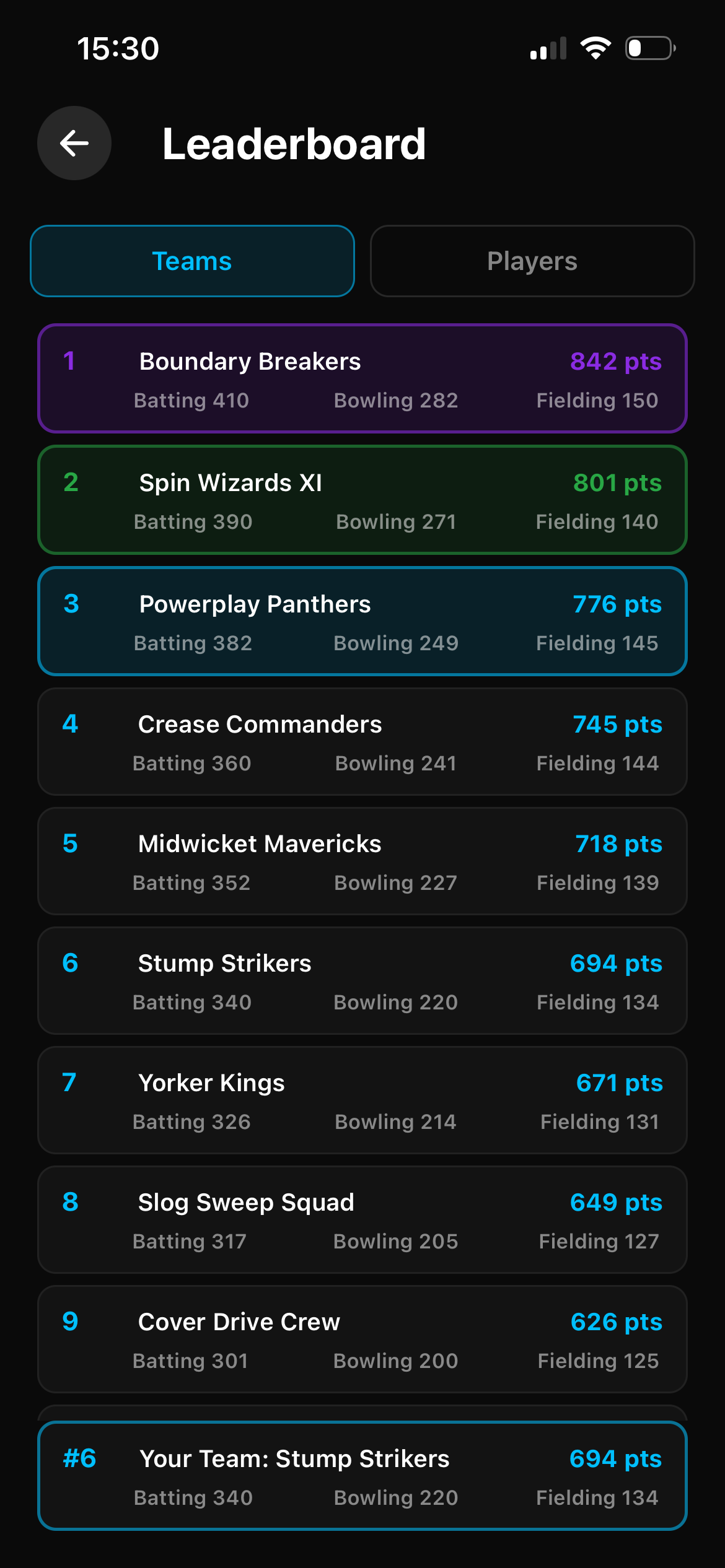 The leaderboard supports tabs for teams and players, so you can see the best fantasy teams and the real players who are earning the most fantasy points.